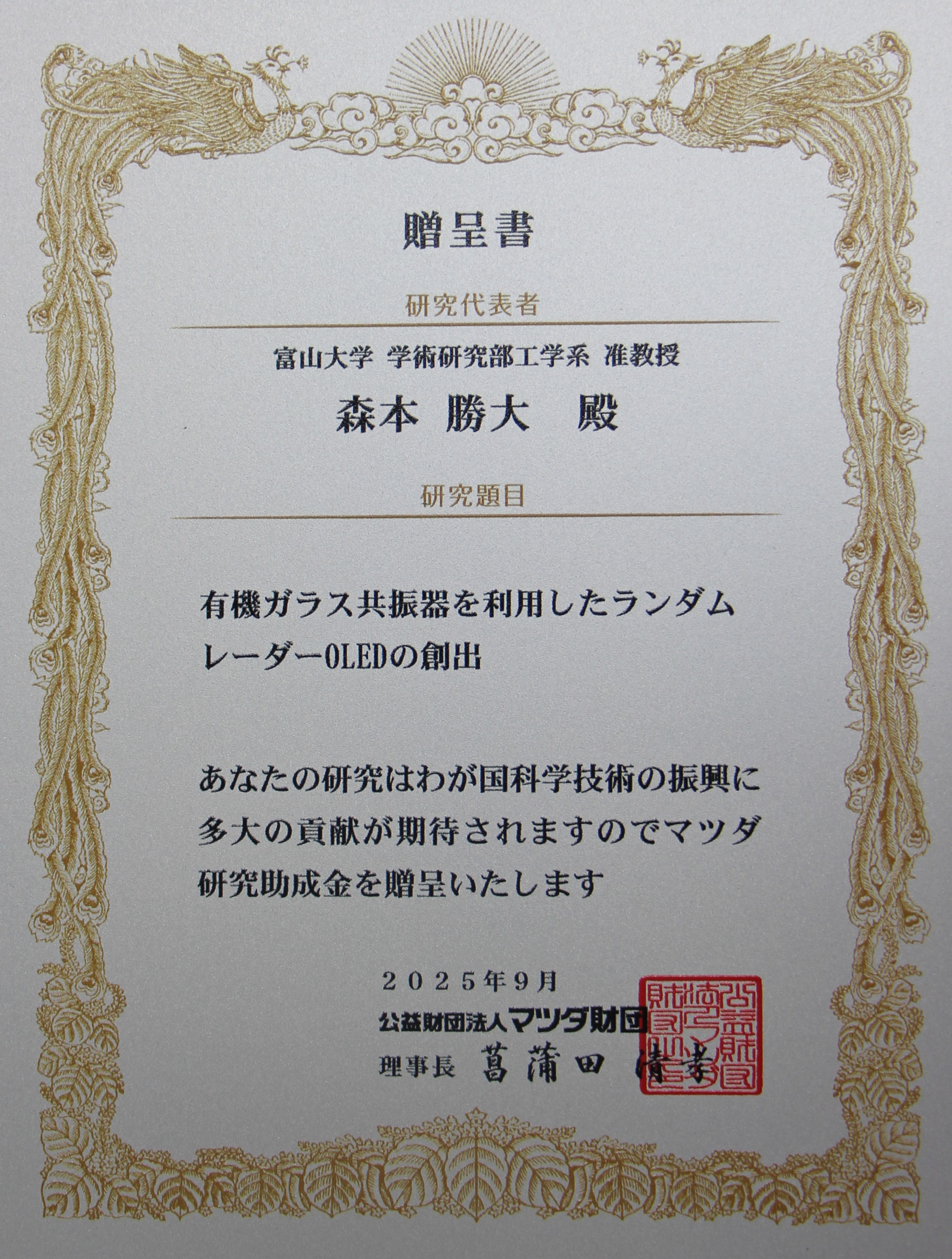 HOME > ニュース > 学術研究部工学系 森本勝大准教授(工学部工学科電気電子工学コース)が、「公益財団法人マツダ財団 第41回(2025年度)マツダ研究助成」に選出され、贈呈式が10月29日(水)に行われました。