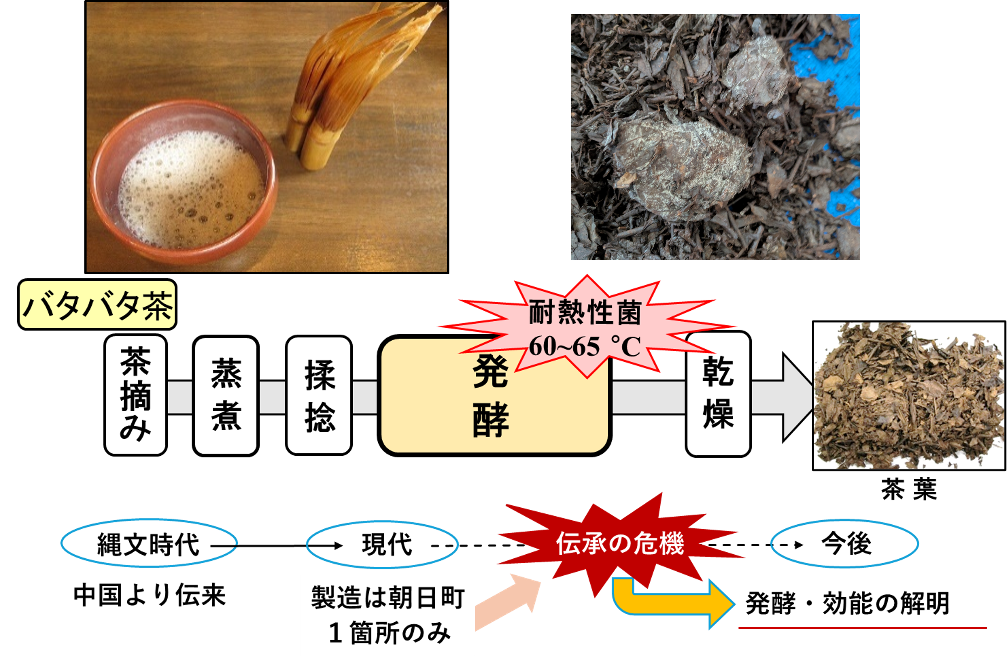 富山県朝日町で親しまれているバタバタ茶は後発酵茶に分類されている。日本における後発酵茶は4種類あるが、それぞれにおいて製造方法が異なっている。バタバタ茶は茶摘み後すぐに蒸煮をし、60℃前後の高温において活性化する好気性耐熱性菌のみで発酵が進行することが特徴である。しかし製造法が口伝で生産量が少なく効能の分析が不十分であり、学術的な研究がほとんどされていない。また、バタバタ茶は製造場所が朝日町にある1か所のみであり、伝承の危機となっている。そこでバタバタ茶の付加価値を高めることを目指し、各種生理活性作用を分析することにより効能を明らかにすることを試みている。