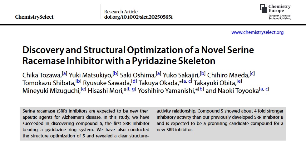 東澤さん (M1)、大島さん (2024年度卒)、前田さん (B4) の研究成果「SRR阻害活性を有するピリダジン化合物の構造最適化」が学術論文 ChemistrySelect に掲載されました(医学部、名古屋大学との共同研究). 2025.10.3